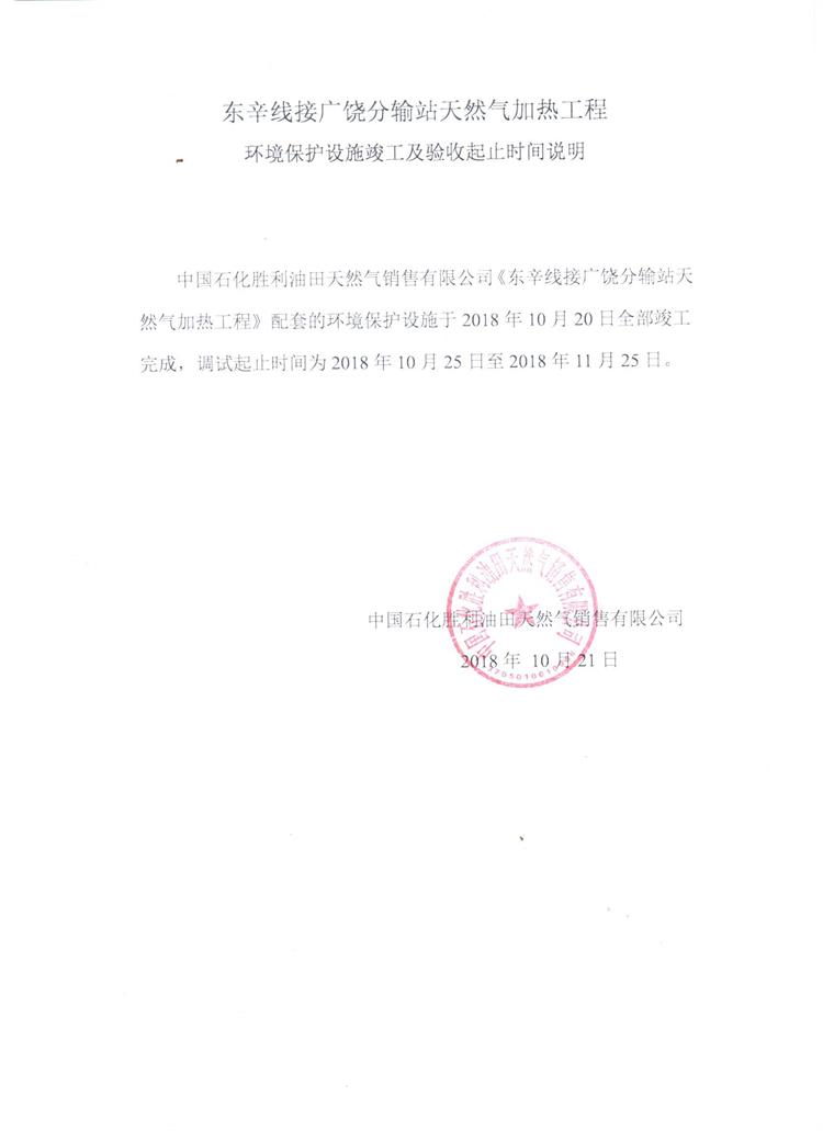 東辛線接廣饒分輸站天然氣加熱工程環境保護設施竣工及驗收起止時間說明