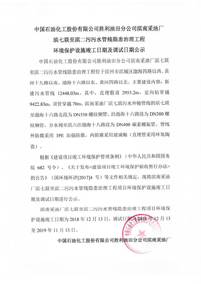中國石油化工股份有限公司勝利油田分公司濱南采油廠濱七聯至濱二污污水管線隱患治理工程環境保護設施竣工日期及調試日期公示
