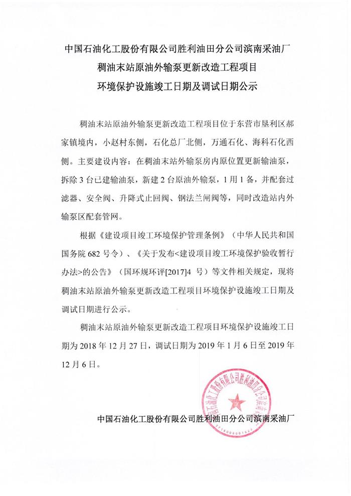 中國石油化工股份有限公司勝利油田分公司濱南采油廠稠油末站原油外輸泵更新改造工程項(xiàng)目環(huán)境保護(hù)設(shè)施竣工日期及調(diào)試日期公示