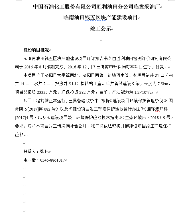 中國石油化工股份有限公司勝利油田分公司臨盤采油廠臨南油田錢五區塊產能建設項目竣工公示