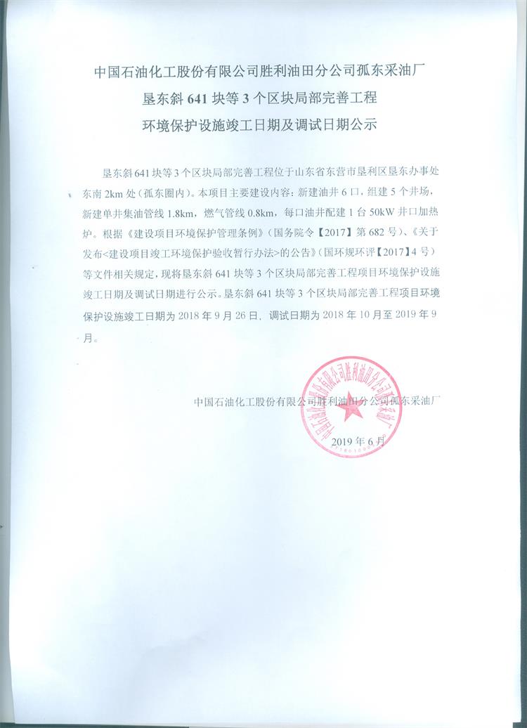 中國石油化工股份有限公司勝利油田分公司孤東采油廠墾東斜641塊等3個區(qū)塊局部完善工程環(huán)境保護(hù)設(shè)施竣工日期及調(diào)試日期公示